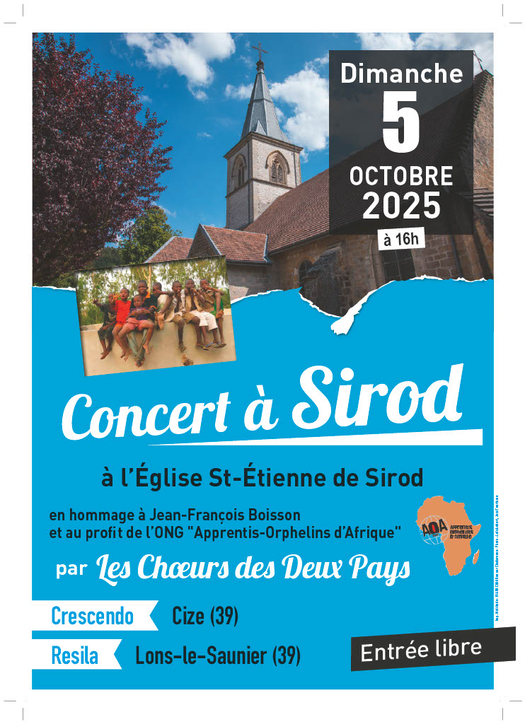 - Dimanche 5 octobre 2025 , Résila et Crescendo de Cize , invitées par l'ONG "Apprentis -orphelins d'Afrique "ont donné un concert en l'église Saint Etienne de Sirod.. Le Président de l'association a chaleureusement remercié la présence du public venu nombreux et l'interprétation des chants très variés ont suscité les applaudissements de l'assistance. Deux chants en commun et le verre de l'amitié ont mis fin à ce bel après midi de partage.